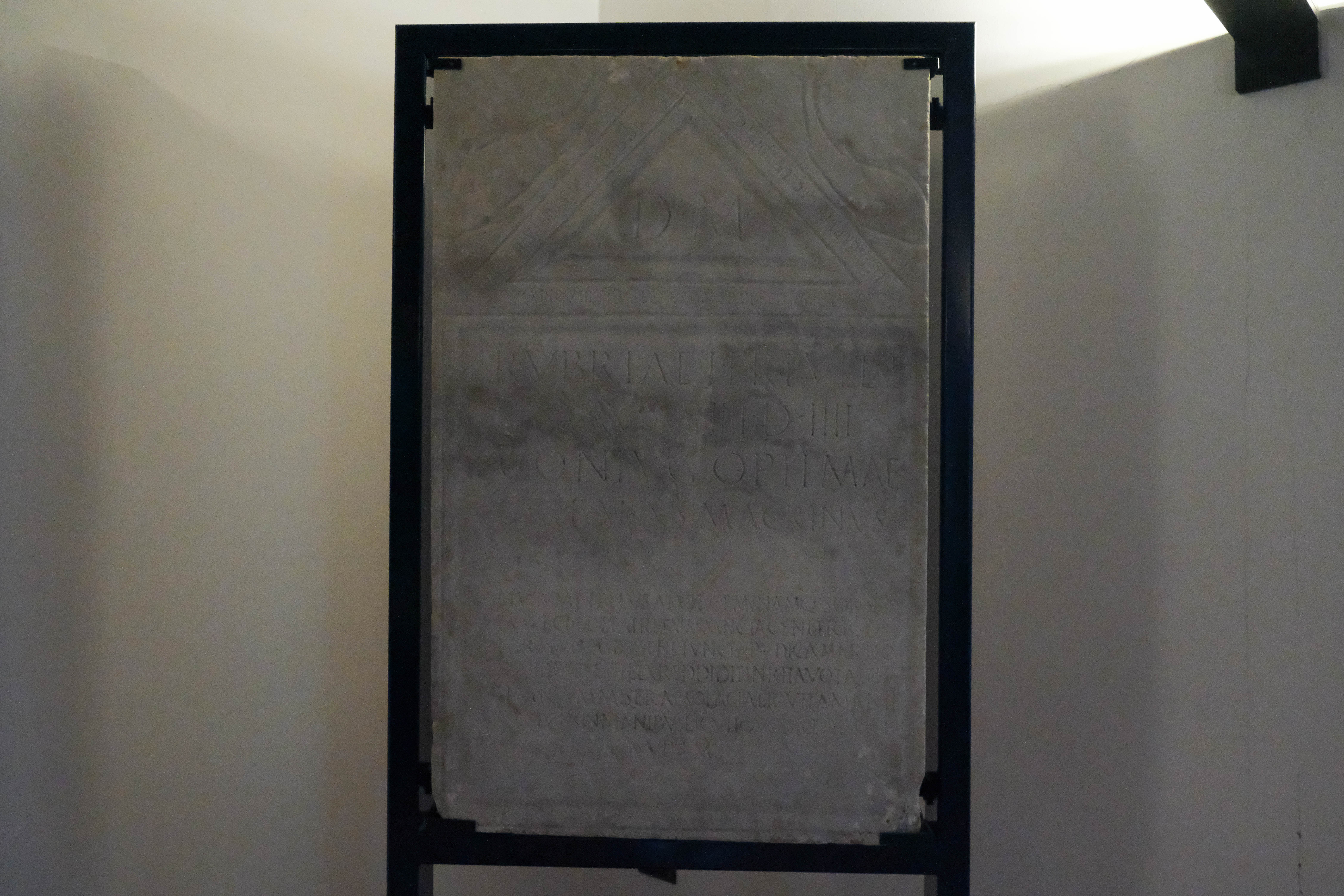 Funerary stele in white marble from the 3rd century A.D., dedicated to Rubria Tertulla, who died at twenty. Erected by her husband Gaius Refanus Macrinus, it depicts two dolphins above the inscription. In the Middle Ages it was reused for the consecration of the church of San Pietro in Bosco (1180).
