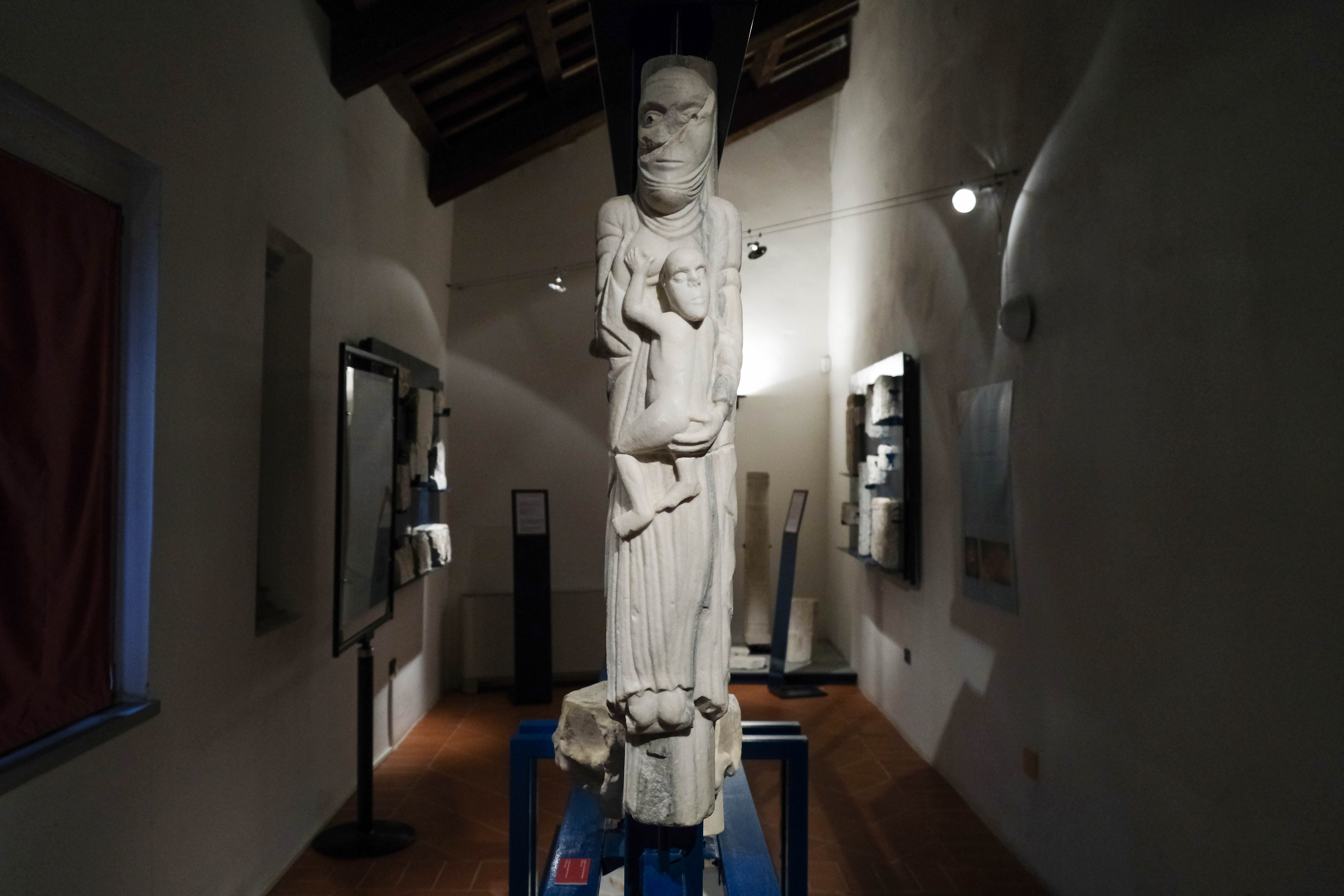 Romanesque column‑statue from the Abbey of St Ellero depicting the childhood of Saint Nicholas. Tradition tells that as a newborn he refused his mother’s milk as a sign of divine election and renunciation of worldly things.