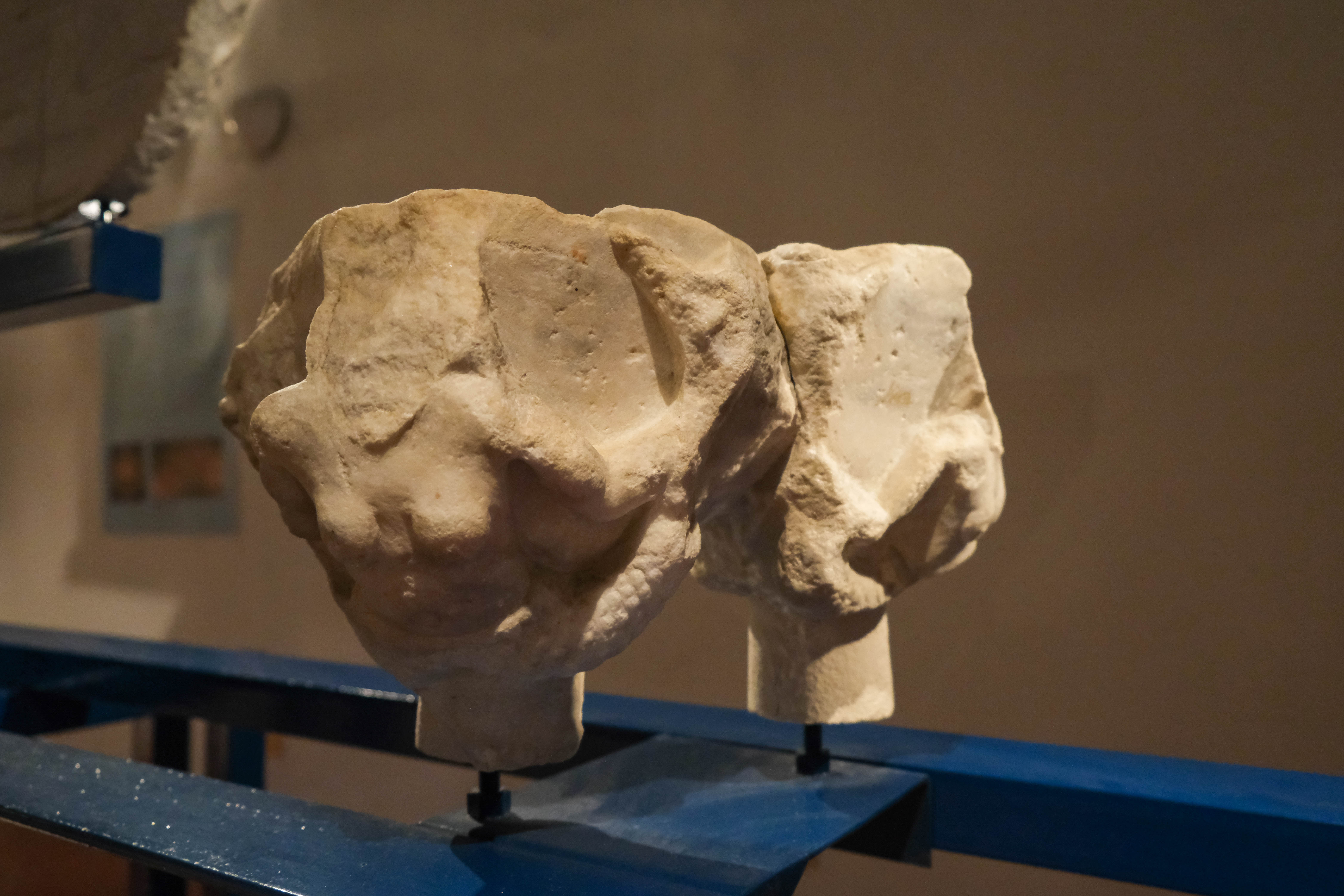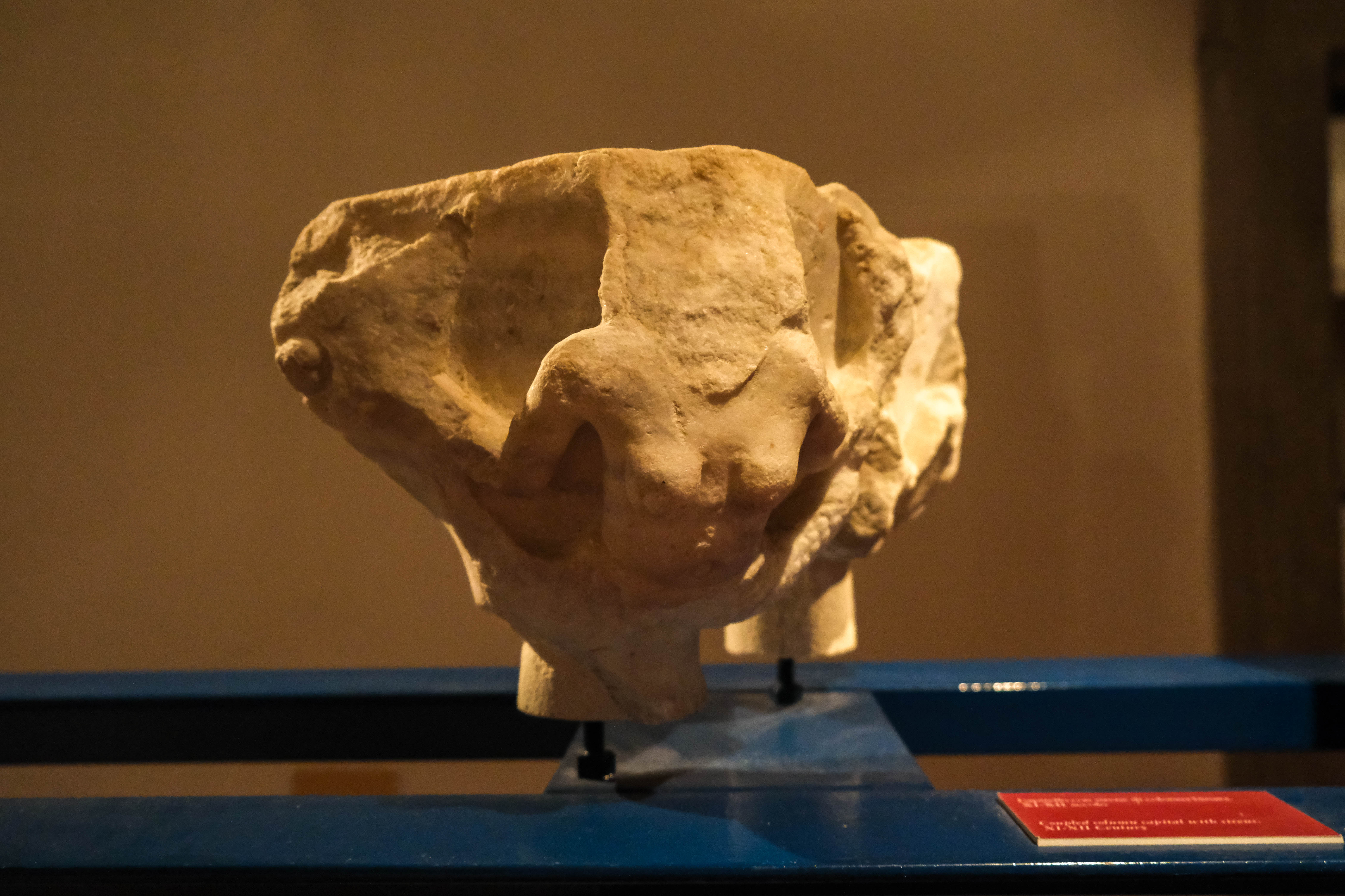Romanesque capital from the Abbey of St Ellero depicting two twin‑tailed mermaids. These creatures embody temptation and sin, dialoguing with other church decorations that represent the struggle between good and evil.