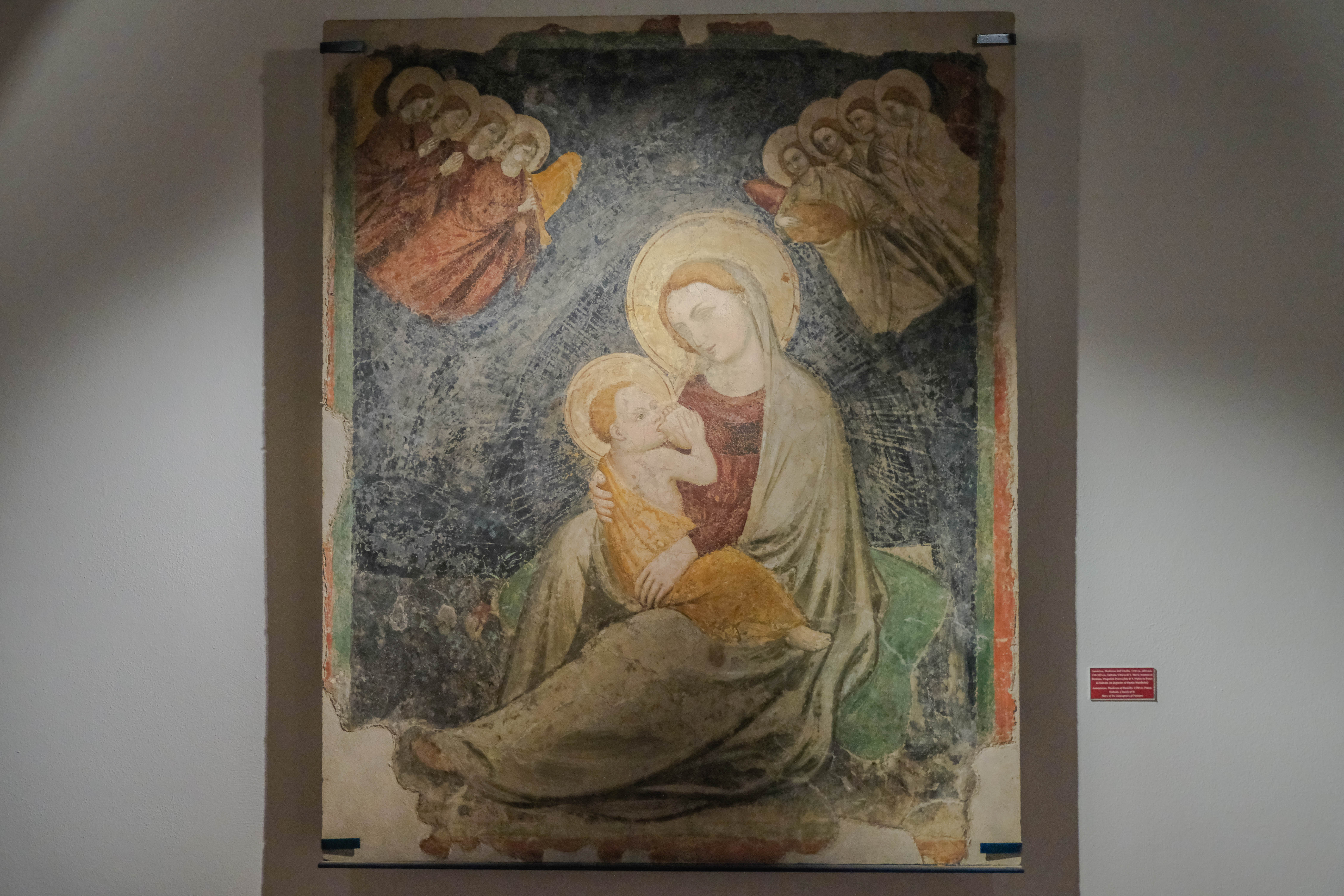 15th‑century fresco from the Church of Santa Maria del Pantano. The Virgin sits on a cushion nursing the Child, while praying and music‑making angels look on. The scene radiates serene, solemn tenderness inspired by Giotto’s style.